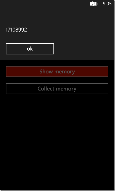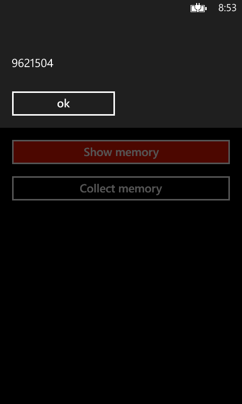 First, let’s create a simple Windows Phone application. The first page will contain three buttons: the first one navigates to another page, the second one displays the amount of memory used (by calling Microsoft.Phone.Info.DeviceStatus.ApplicationCurrentMemoryUsage), and the last one will forcefully call the garbage collector, wait for the finalizers to execute, and collect the memory freed by those finalizers: